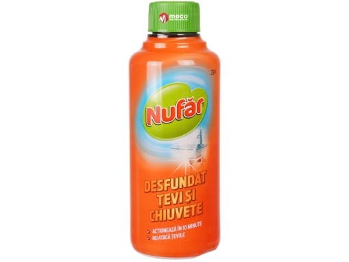 "Nufăr Desfundat Țevi" este o soluție lichidă chimică destinată curățării și desfundării țevilor de scurgere din bucătărie și baie, care dizolvă rapid blocajele cauzate de resturi, păr și alte impurități, și elimină mirosurile neplăcute.